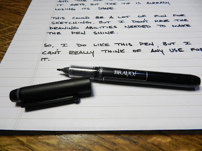 A few weeks ago I made trip to my campus bookstore.  One of the items I picked up was this, the Pilot Bravo, a pen I had never before seen on any store shelf. This is the same store where I found the Alvin Penstix I recently reviewed. As it was sitting on the shelf, I initially thought it was a Pilot Varsity and, as you can see, the barrel and cap are quite similar to a Varsity.